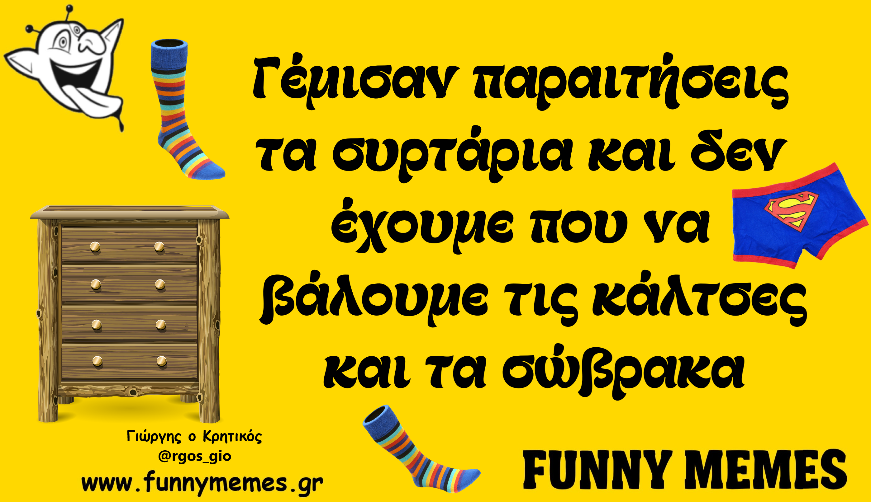 - Αγορές Αναδρομές Για παντρεμένους Για τα ζώα Για τα παιδιά Για τη μαμά Για τον μπαμπά Για χωρισμένους Δημοσιογραφία Εργασιακά Καλές πράξεις Μακάβρια Πολιτική Σοφά λόγια Σόκιν Τα αθλητικά Τα αντρικά Τα εγκληματικά Τα εργασιακά Τα ιατρικά Τα ιστορικά Τα καλλιτεχνικά Τα κατεψυγμένα Τα μακάβρια Τα μεταφυσικά Τα σόκιν Τα τεχνολογικά Τα φοιτητικά Τα ψεκασμένα Της διασκέδασης Της κρίσης Του έρωτα Τσίου memes Φωτορεπορτάζ