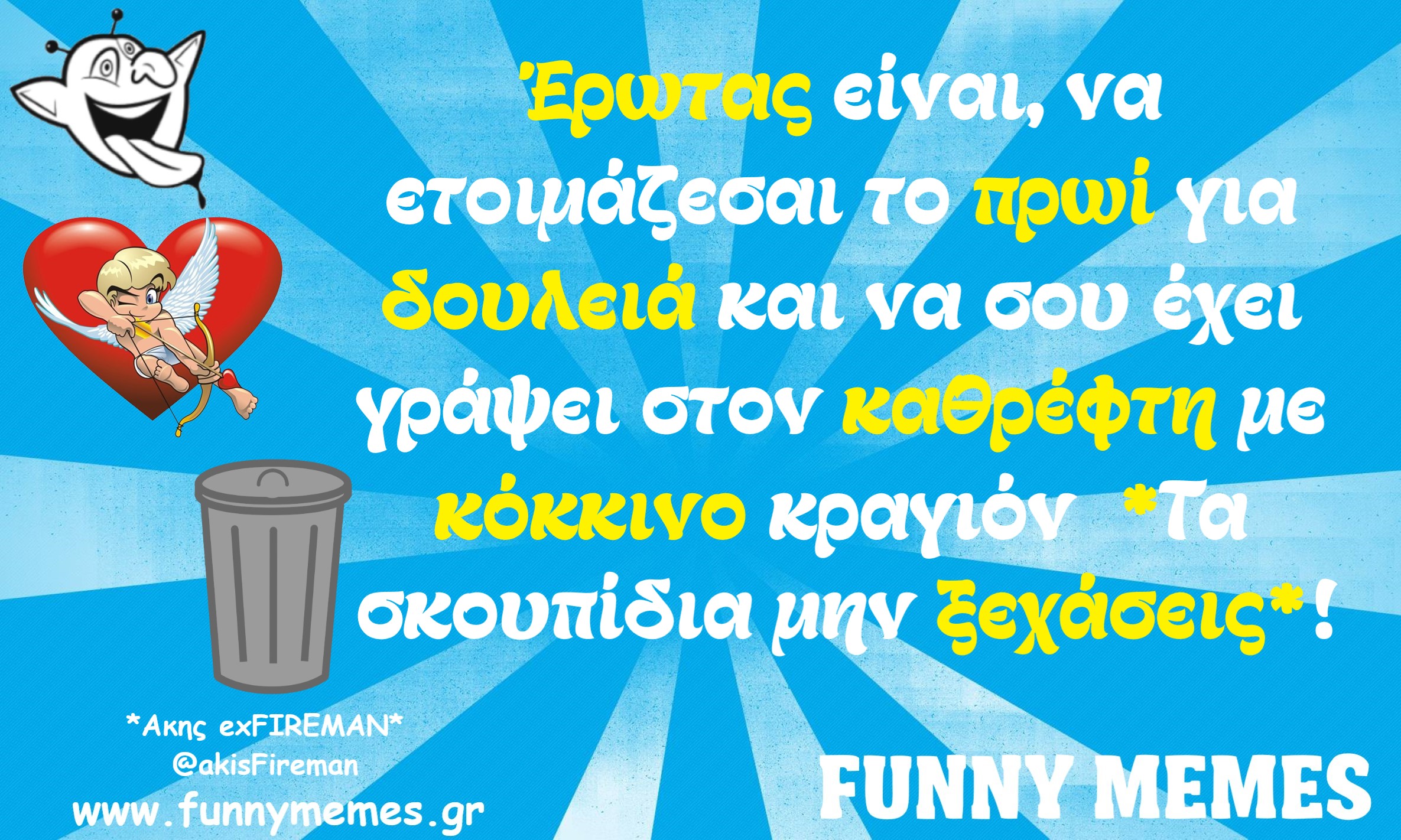 - Αγορές Αναδρομές Για παντρεμένους Για τα ζώα Για τα παιδιά Για τη μαμά Για τον μπαμπά Για χωρισμένους Δημοσιογραφία Εργασιακά Καλές πράξεις Μακάβρια Πολιτική Σοφά λόγια Σόκιν Τα αθλητικά Τα αντρικά Τα εγκληματικά Τα εργασιακά Τα ιατρικά Τα ιστορικά Τα καλλιτεχνικά Τα κατεψυγμένα Τα μακάβρια Τα μεταφυσικά Τα σόκιν Τα τεχνολογικά Τα φοιτητικά Τα ψεκασμένα Της διασκέδασης Της κρίσης Του έρωτα Τσίου memes Φωτορεπορτάζ