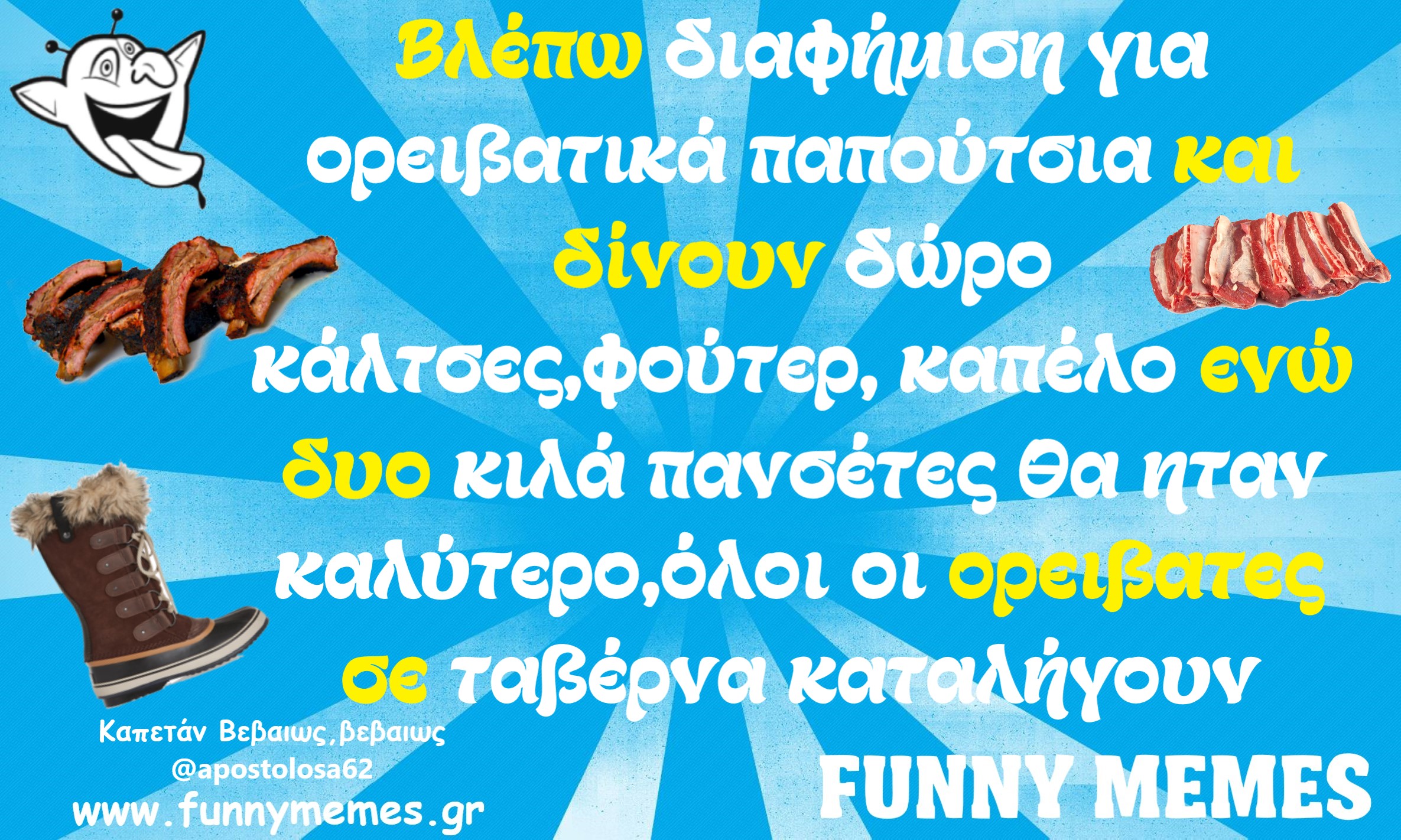 - Αγορές Αναδρομές Για παντρεμένους Για τα ζώα Για τα παιδιά Για τη μαμά Για τον μπαμπά Για χωρισμένους Δημοσιογραφία Εργασιακά Καλές πράξεις Μακάβρια Πολιτική Σοφά λόγια Σόκιν Τα αθλητικά Τα αντρικά Τα εγκληματικά Τα εργασιακά Τα ιατρικά Τα ιστορικά Τα καλλιτεχνικά Τα κατεψυγμένα Τα μακάβρια Τα μεταφυσικά Τα σόκιν Τα τεχνολογικά Τα φοιτητικά Τα ψεκασμένα Της διασκέδασης Της κρίσης Του έρωτα Τσίου memes Φωτορεπορτάζ