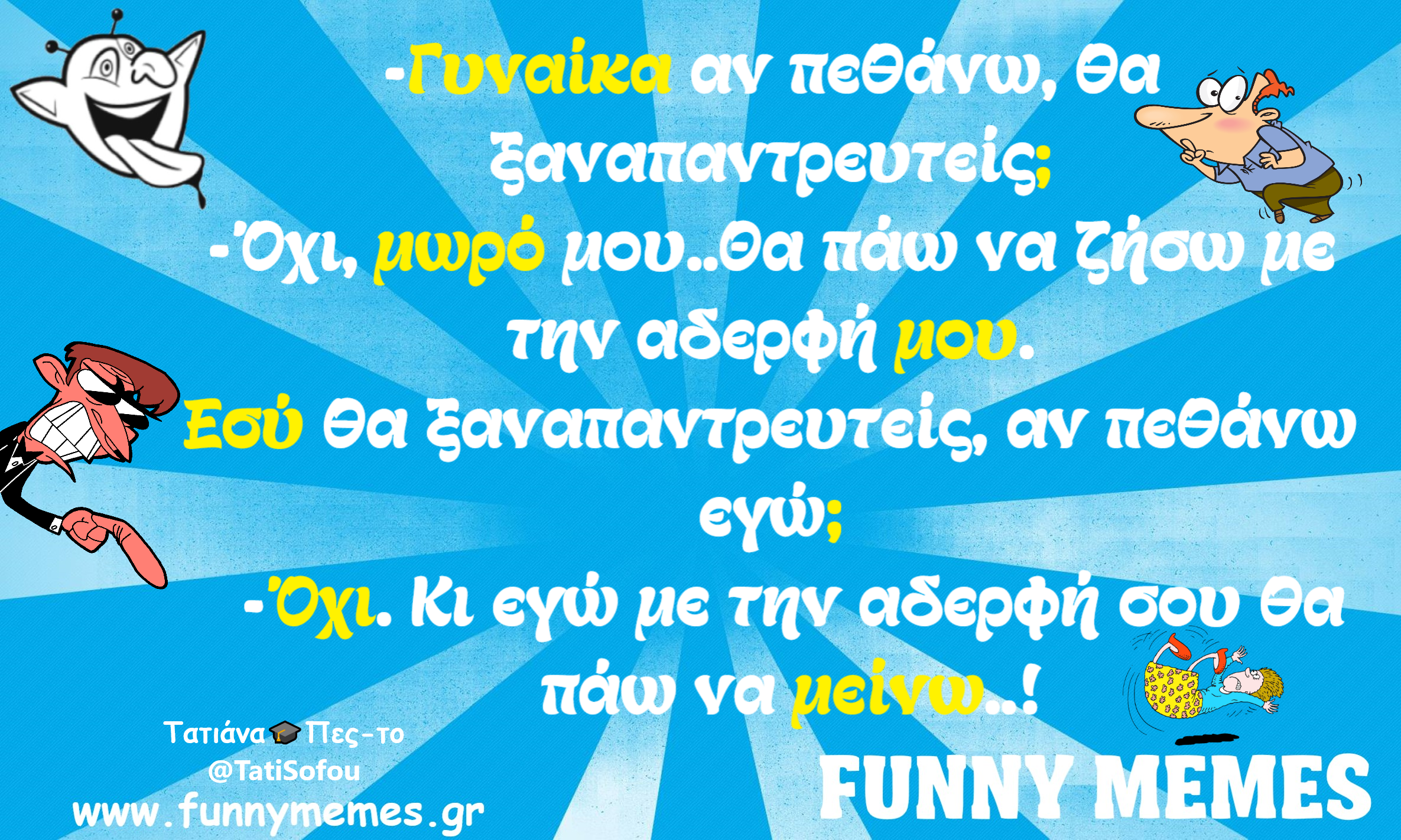 - Αγορές Αναδρομές Για παντρεμένους Για τα ζώα Για τα παιδιά Για τη μαμά Για τον μπαμπά Για χωρισμένους Δημοσιογραφία Εργασιακά Καλές πράξεις Μακάβρια Πολιτική Σοφά λόγια Σόκιν Τα αθλητικά Τα αντρικά Τα εγκληματικά Τα εργασιακά Τα ιατρικά Τα ιστορικά Τα καλλιτεχνικά Τα κατεψυγμένα Τα μακάβρια Τα μεταφυσικά Τα σόκιν Τα τεχνολογικά Τα φοιτητικά Τα ψεκασμένα Της διασκέδασης Της κρίσης Του έρωτα Τσίου memes Φωτορεπορτάζ