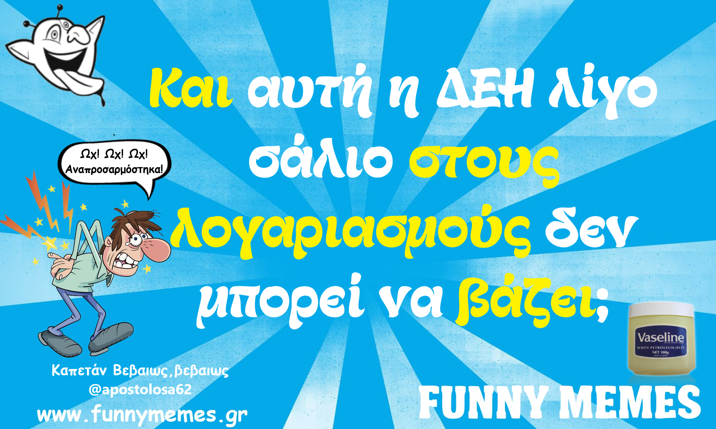- Αγορές Αναδρομές Για παντρεμένους Για τα ζώα Για τα παιδιά Για τη μαμά Για τον μπαμπά Για χωρισμένους Δημοσιογραφία Εργασιακά Καλές πράξεις Μακάβρια Πολιτική Σοφά λόγια Σόκιν Τα αθλητικά Τα αντρικά Τα εγκληματικά Τα εργασιακά Τα ιατρικά Τα ιστορικά Τα καλλιτεχνικά Τα κατεψυγμένα Τα μακάβρια Τα μεταφυσικά Τα σόκιν Τα τεχνολογικά Τα φοιτητικά Τα ψεκασμένα Της διασκέδασης Της κρίσης Του έρωτα Τσίου memes Φωτορεπορτάζ
