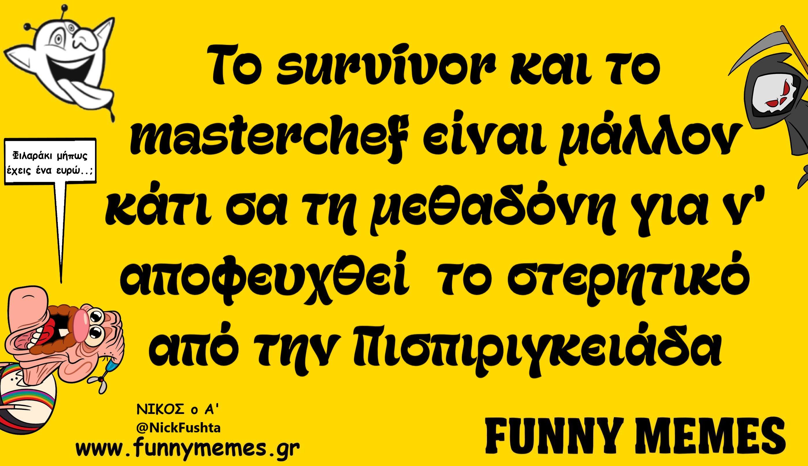 - Αγορές Αναδρομές Για παντρεμένους Για τα ζώα Για τα παιδιά Για τη μαμά Για τον μπαμπά Για χωρισμένους Δημοσιογραφία Εργασιακά Καλές πράξεις Μακάβρια Πολιτική Σοφά λόγια Σόκιν Τα αθλητικά Τα αντρικά Τα εγκληματικά Τα εργασιακά Τα ιατρικά Τα ιστορικά Τα καλλιτεχνικά Τα κατεψυγμένα Τα μακάβρια Τα μεταφυσικά Τα σόκιν Τα τεχνολογικά Τα φοιτητικά Τα ψεκασμένα Της διασκέδασης Της κρίσης Του έρωτα Τσίου memes Φωτορεπορτάζ