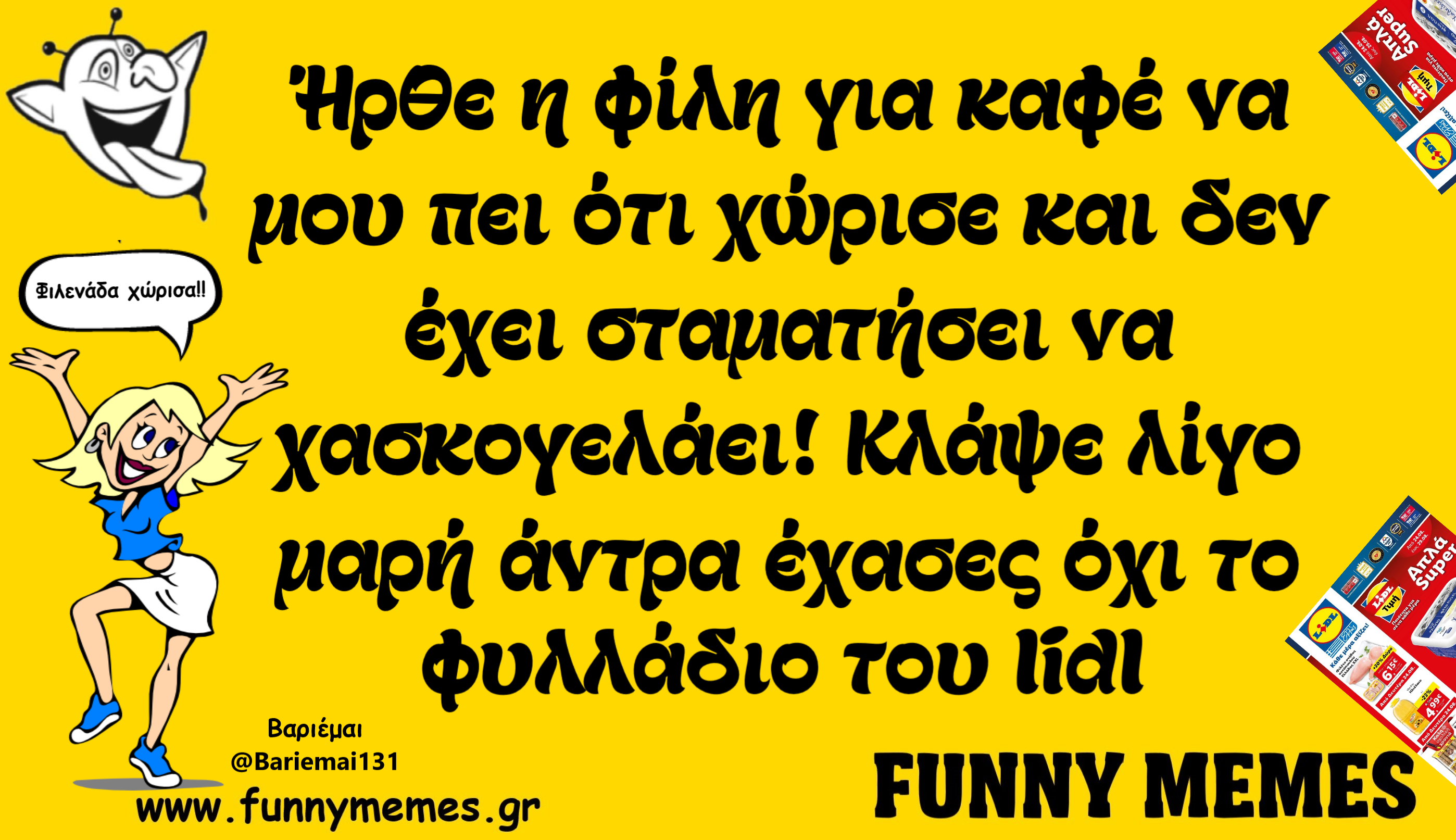 - Αγορές Αναδρομές Για παντρεμένους Για τα ζώα Για τα παιδιά Για τη μαμά Για τον μπαμπά Για χωρισμένους Δημοσιογραφία Εργασιακά Καλές πράξεις Μακάβρια Πολιτική Σοφά λόγια Σόκιν Τα αθλητικά Τα αντρικά Τα εγκληματικά Τα εργασιακά Τα ιατρικά Τα ιστορικά Τα καλλιτεχνικά Τα κατεψυγμένα Τα μακάβρια Τα μεταφυσικά Τα σόκιν Τα τεχνολογικά Τα φοιτητικά Τα ψεκασμένα Της διασκέδασης Της κρίσης Του έρωτα Τσίου memes Φωτορεπορτάζ