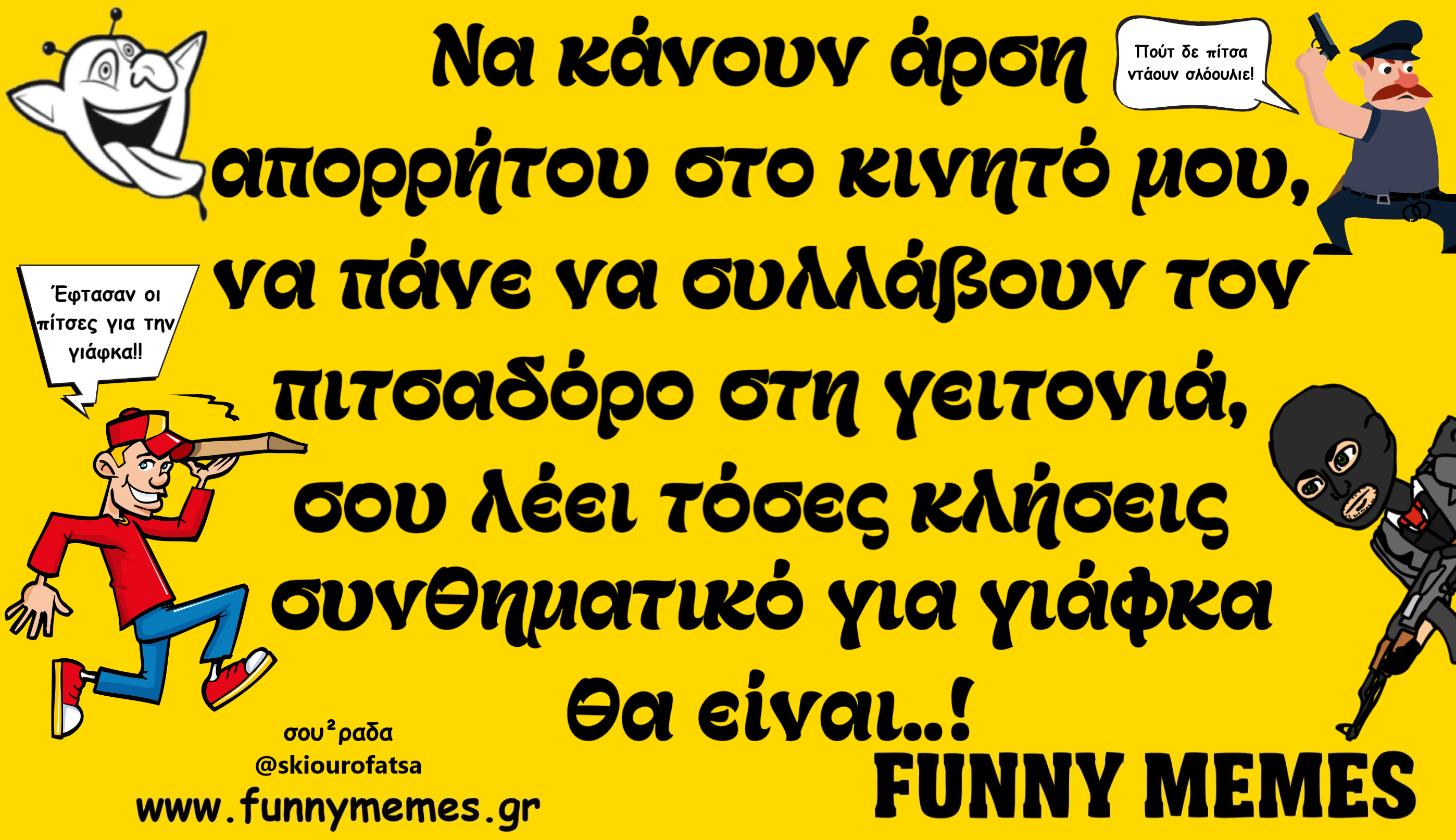 - Αγορές Αναδρομές Για παντρεμένους Για τα ζώα Για τα παιδιά Για τη μαμά Για τον μπαμπά Για χωρισμένους Δημοσιογραφία Εργασιακά Καλές πράξεις Μακάβρια Πολιτική Σοφά λόγια Σόκιν Τα αθλητικά Τα αντρικά Τα εγκληματικά Τα εργασιακά Τα ιατρικά Τα ιστορικά Τα καλλιτεχνικά Τα κατεψυγμένα Τα μακάβρια Τα μεταφυσικά Τα σόκιν Τα τεχνολογικά Τα φοιτητικά Τα ψεκασμένα Της διασκέδασης Της κρίσης Του έρωτα Τσίου memes Φωτορεπορτάζ