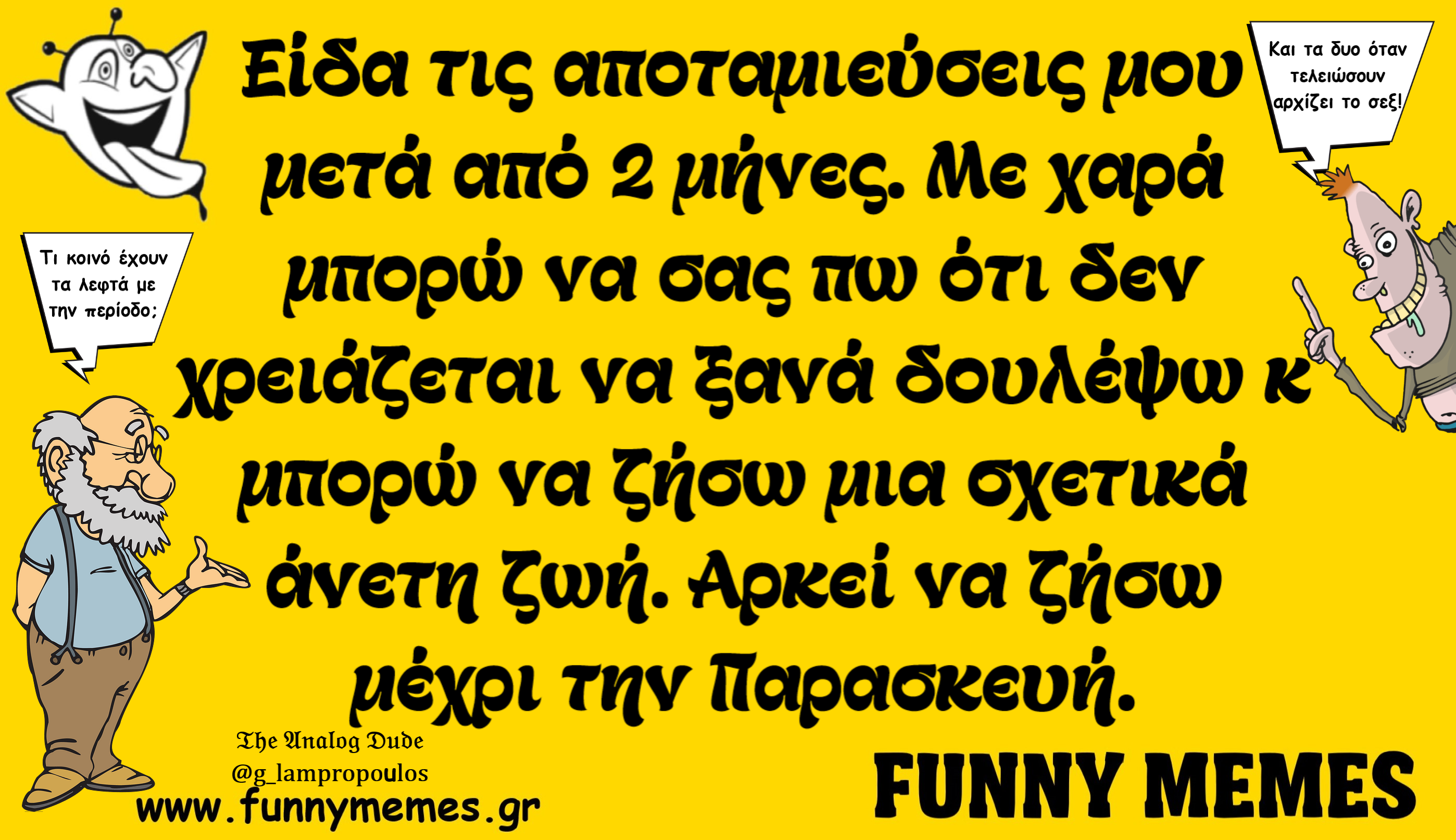 - Αγορές Αναδρομές Για παντρεμένους Για τα ζώα Για τα παιδιά Για τη μαμά Για τον μπαμπά Για χωρισμένους Δημοσιογραφία Εργασιακά Καλές πράξεις Μακάβρια Πολιτική Σοφά λόγια Σόκιν Τα αθλητικά Τα αντρικά Τα εγκληματικά Τα εργασιακά Τα ιατρικά Τα ιστορικά Τα καλλιτεχνικά Τα κατεψυγμένα Τα μακάβρια Τα μεταφυσικά Τα σόκιν Τα τεχνολογικά Τα φοιτητικά Τα ψεκασμένα Της διασκέδασης Της κρίσης Του έρωτα Τσίου memes Φωτορεπορτάζ