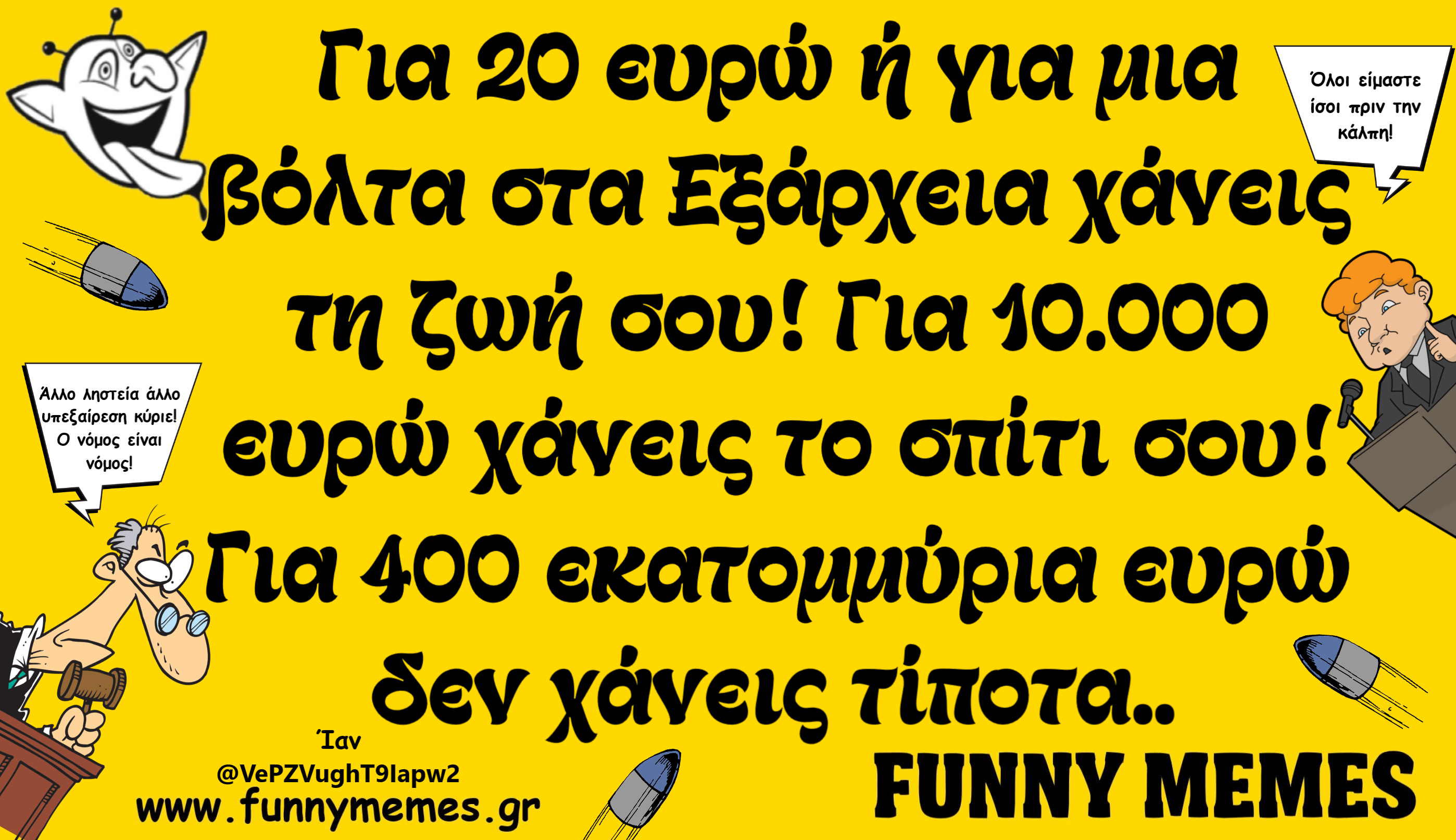 - Αγορές Αναδρομές Για παντρεμένους Για τα ζώα Για τα παιδιά Για τη μαμά Για τον μπαμπά Για χωρισμένους Δημοσιογραφία Εργασιακά Καλές πράξεις Μακάβρια Πολιτική Σοφά λόγια Σόκιν Τα αθλητικά Τα αντρικά Τα εγκληματικά Τα εργασιακά Τα ιατρικά Τα ιστορικά Τα καλλιτεχνικά Τα κατεψυγμένα Τα μακάβρια Τα μεταφυσικά Τα σόκιν Τα τεχνολογικά Τα φοιτητικά Τα ψεκασμένα Της διασκέδασης Της κρίσης Του έρωτα Τσίου memes Φωτορεπορτάζ