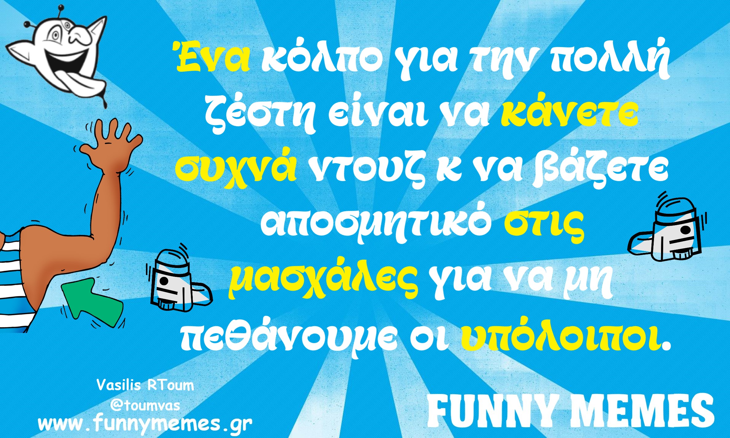 - Αγορές Αναδρομές Για παντρεμένους Για τα ζώα Για τα παιδιά Για τη μαμά Για τον μπαμπά Για χωρισμένους Δημοσιογραφία Εργασιακά Καλές πράξεις Μακάβρια Πολιτική Σοφά λόγια Σόκιν Τα αθλητικά Τα αντρικά Τα εγκληματικά Τα εργασιακά Τα ιατρικά Τα ιστορικά Τα καλλιτεχνικά Τα κατεψυγμένα Τα μακάβρια Τα μεταφυσικά Τα σόκιν Τα τεχνολογικά Τα φοιτητικά Τα ψεκασμένα Της διασκέδασης Της κρίσης Του έρωτα Τσίου memes Φωτορεπορτάζ