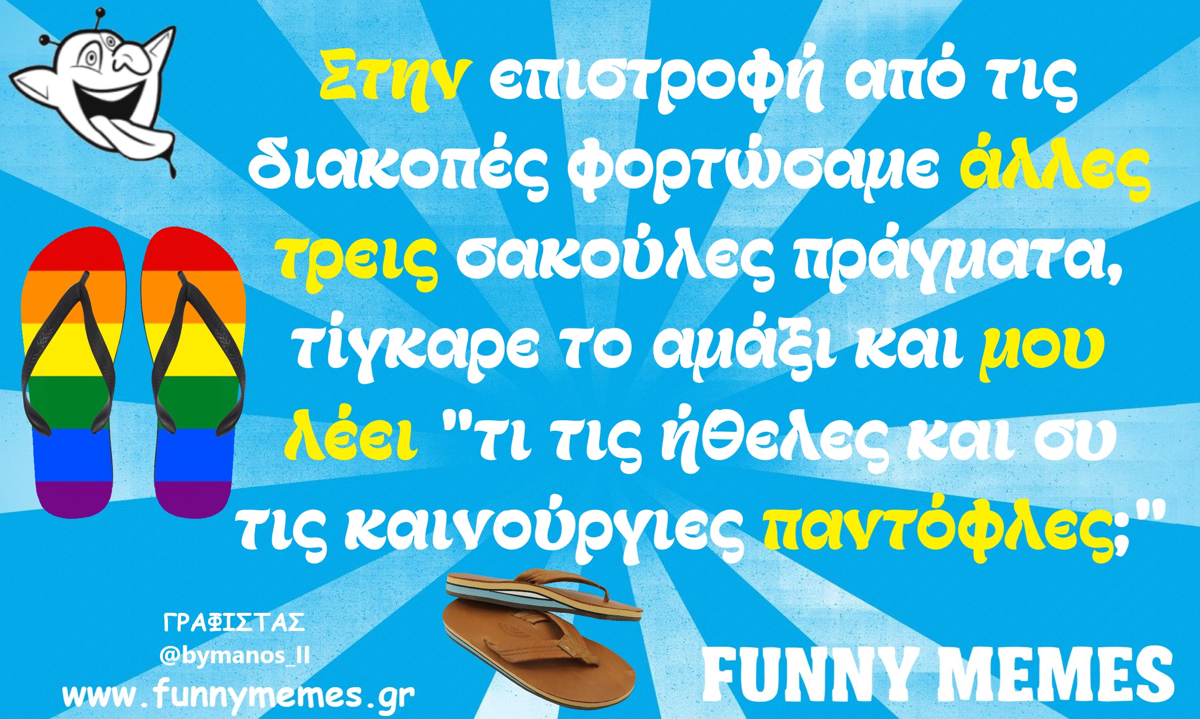 - Αγορές Αναδρομές Για παντρεμένους Για τα ζώα Για τα παιδιά Για τη μαμά Για τον μπαμπά Για χωρισμένους Δημοσιογραφία Εργασιακά Καλές πράξεις Μακάβρια Πολιτική Σοφά λόγια Σόκιν Τα αθλητικά Τα αντρικά Τα εγκληματικά Τα εργασιακά Τα ιατρικά Τα ιστορικά Τα καλλιτεχνικά Τα κατεψυγμένα Τα μακάβρια Τα μεταφυσικά Τα σόκιν Τα τεχνολογικά Τα φοιτητικά Τα ψεκασμένα Της διασκέδασης Της κρίσης Του έρωτα Τσίου memes Φωτορεπορτάζ
